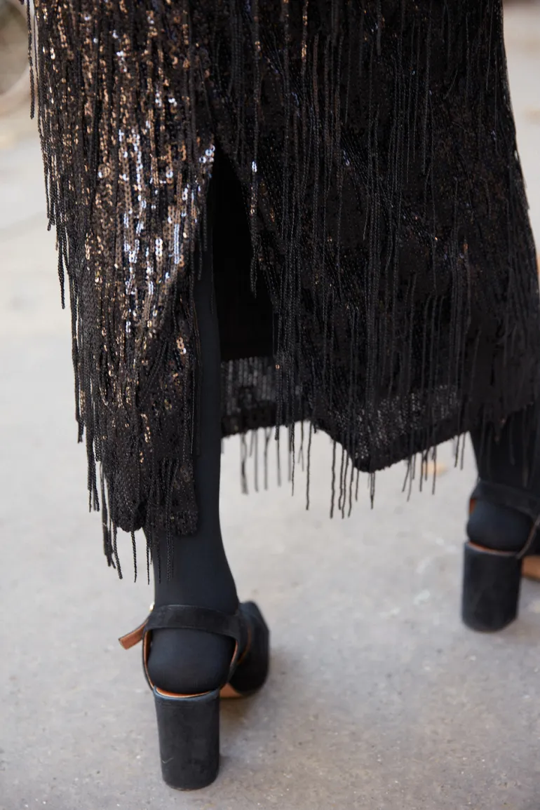 Notre jupe Suzanne, inspirée des années 20, est l’une des pièces phares de cette collection. Grâce à ses sequins et ses franges, ce modèle se suffit à lui-même : vous pouvez l’associer à un pull pour un look plus casual ou à une blouse pour une tenue plus sophistiquée.