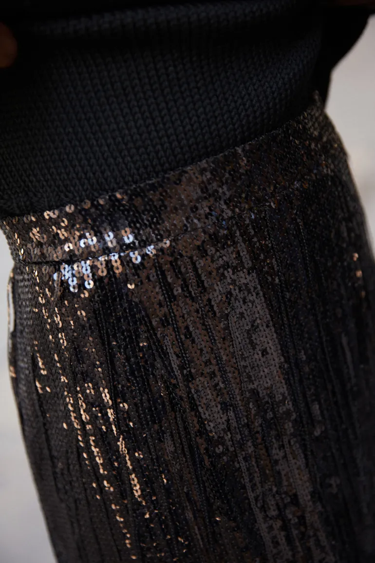 Jupe longue à sequins noirs. Fermeture zip au dos.